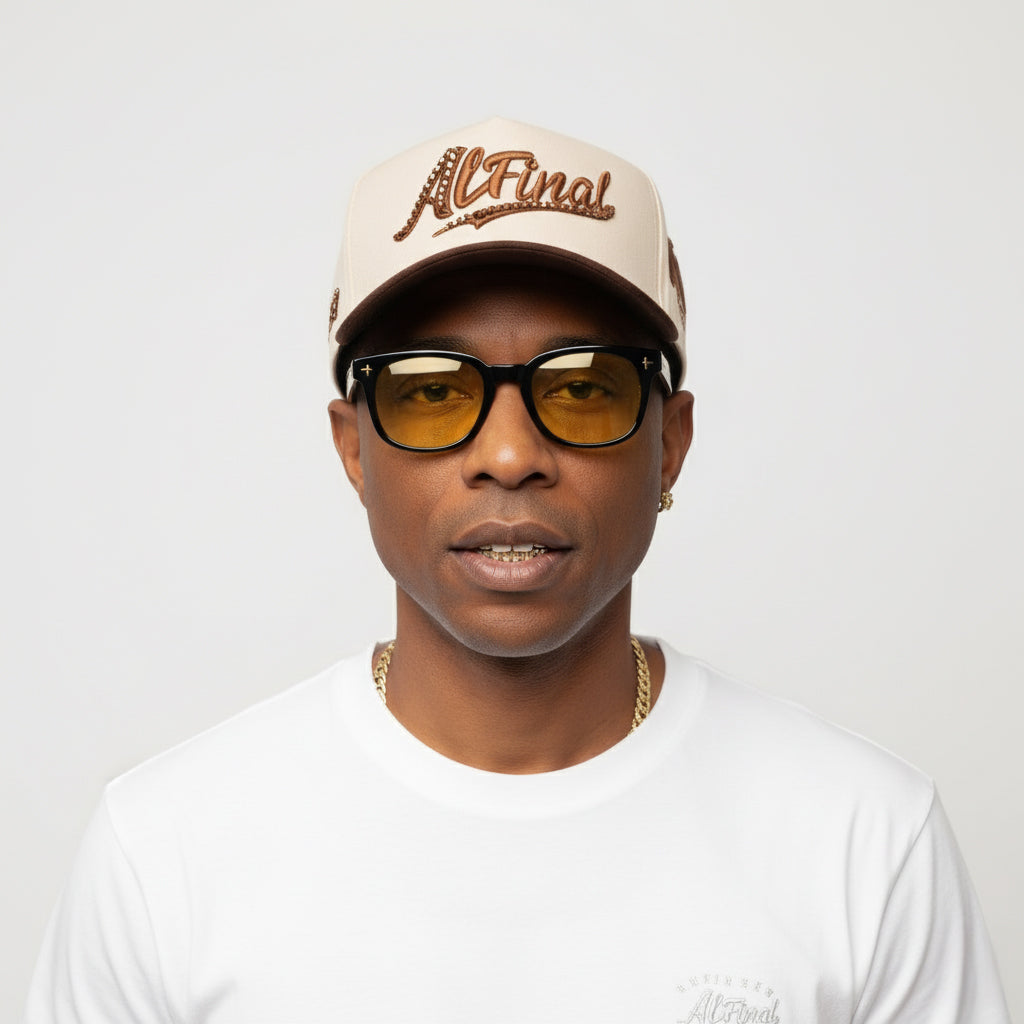 Un tributo al sabor que crece en tierra dominicana y al estilo que no se derrite. La Choco Rica combina un cuerpo beige con visera marrón y el logo Al Final bordado en marrón chocolate, adornado con cristales que capturan la luz como un bombón bajo el sol.
