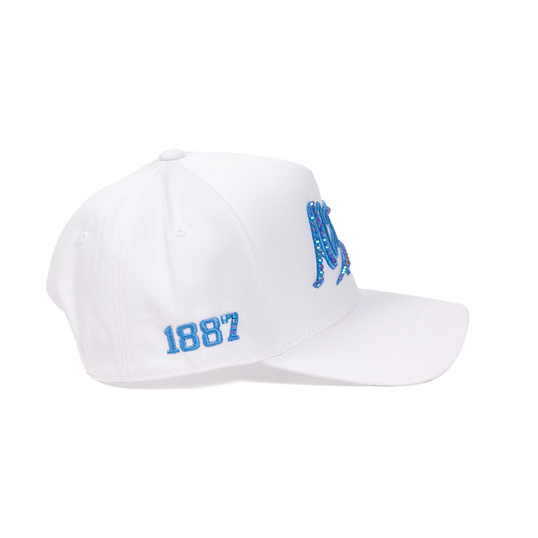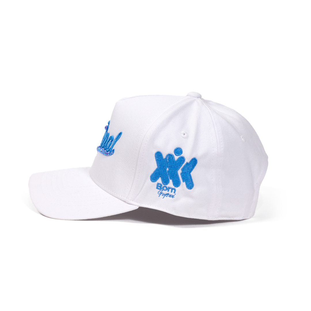 Esta gorra blanca con acentos en azul hielo está hecha pa’ brillar bajo las luces. El “AlFinal” al frente con cristales te da un vibe celestial. Es limpia, fresca, y con el glow pa' cerrar la noche en alta.