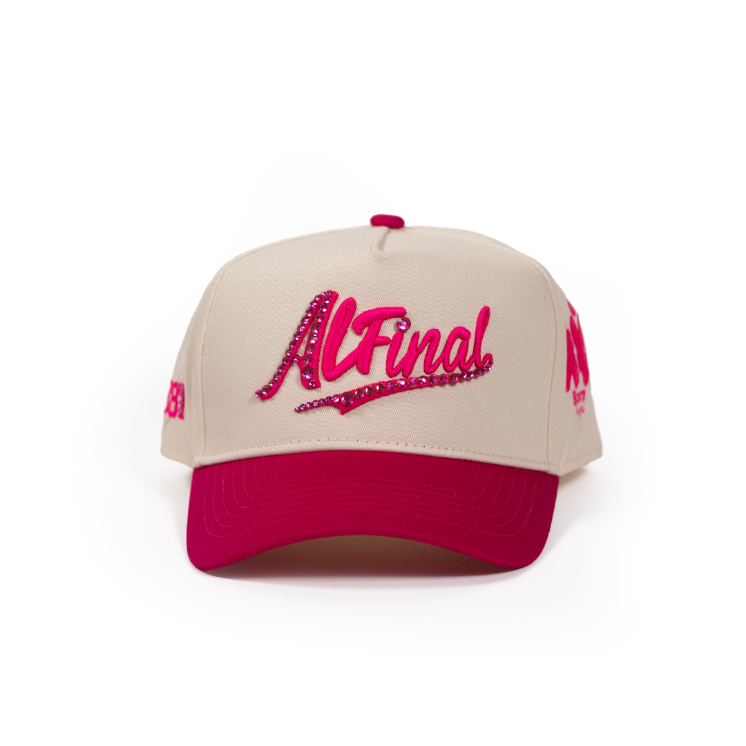 Una pieza que no vino a pedir permiso. Esta gorra mezcla el beige con un rosado fresa que da boche sin hablar. El logo “Al Final” brilla con cristales como si fueran grillz, con una vibra tan escandalosa como el flow del mismísimo Kiko. Ideal pa’ salir a romper tarima o darte una vuelta por el barrio sabiendo que tú eres el highlight. Esto no es moda, es una actitud.
